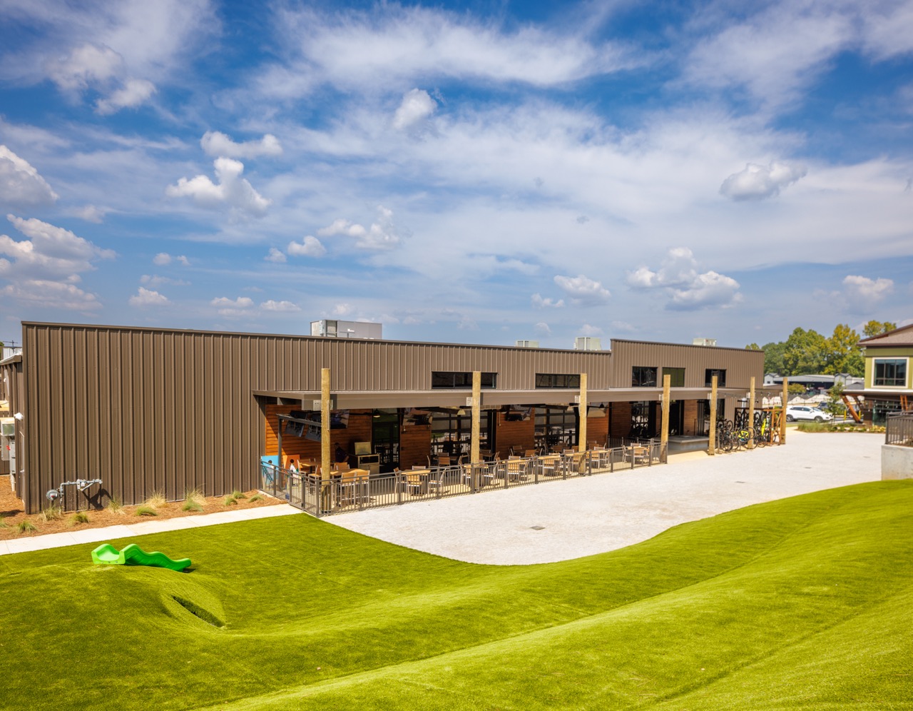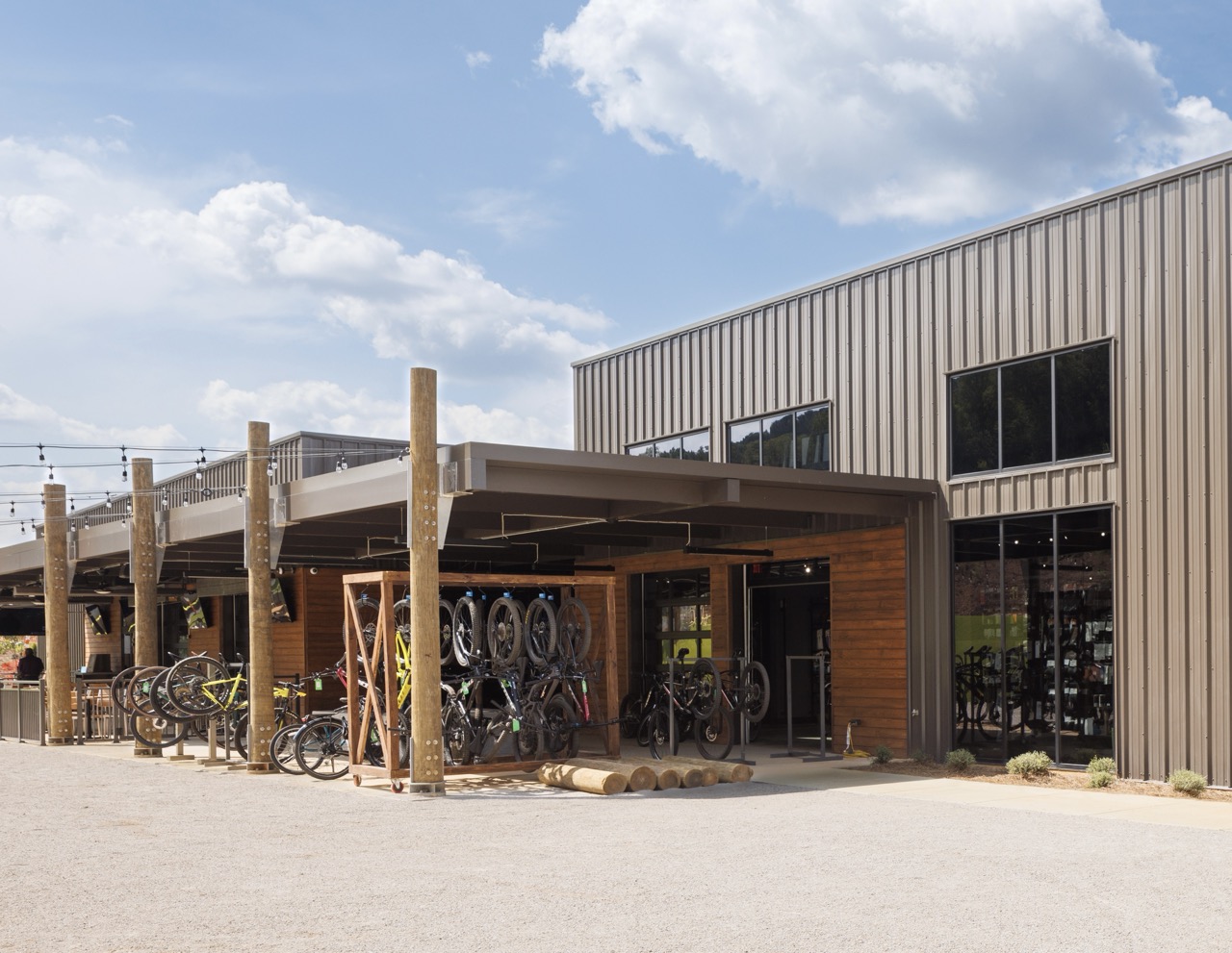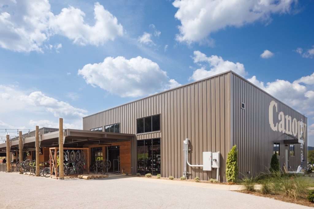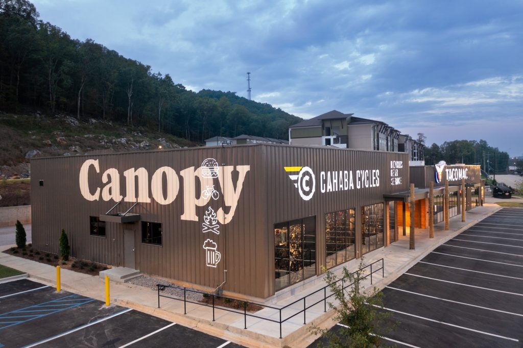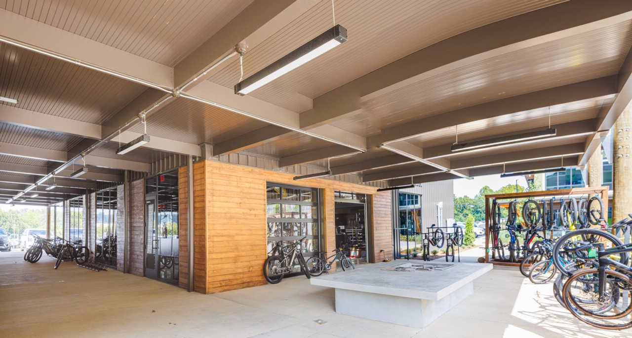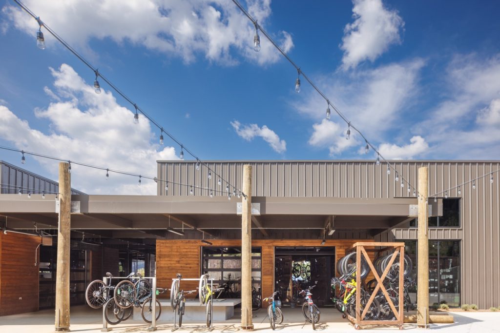 In 2023, Barrett Kent gave the BaseBamp building in Pelham, Alabama, a fresh, new look so that Cahaba Cycles and Taco Mac could coexist in one cohesive space.