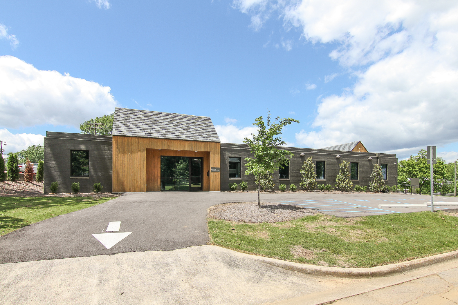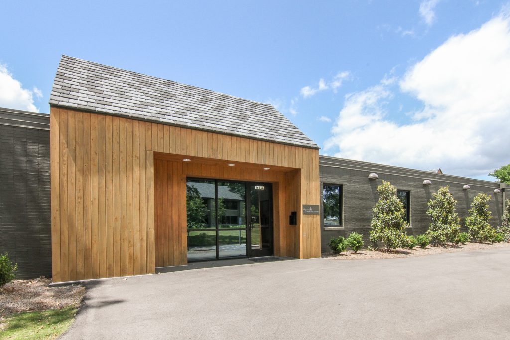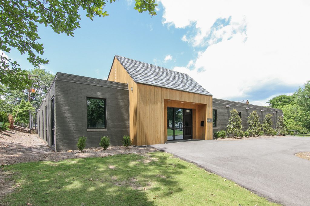Existing masonry has been painted. New materials are eastern white cedar siding and synthetic slate roofing. Vertical wood siding gives relief from an otherwise very horizontal building.