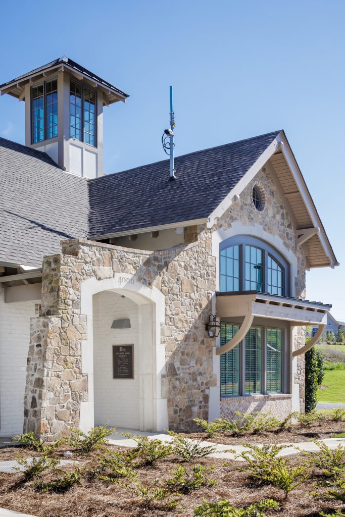 The design team took careful consideration in selecting the stone, painted brick and residential windows in order to blend with the surrounding residential neighborhood. Using a subtle color palette, incorporating lanterns, and craftsman details helped this institutional building nestle into this bustling residential community.