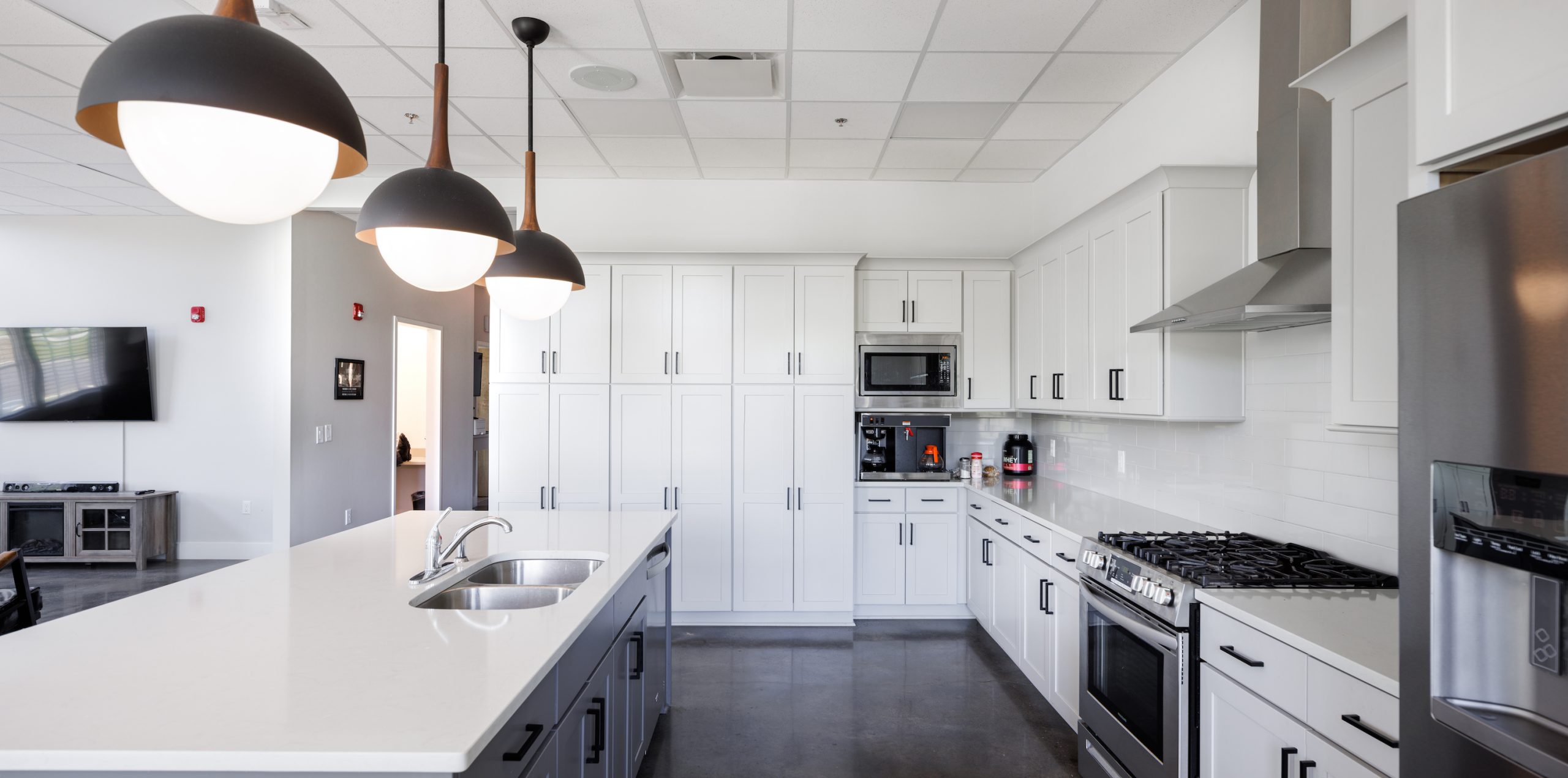 The Apparatus Bay exemplifies efficiency. Although the space showcases the Engine, this space is designed with functionality in mind. From how the firefighters access the truck to mechanical systems to control the off-gassing of the truck after a fire. Another important function of the fire station is the living quarters. The kitchen was designed for daily use, as well as events hosted by the department. This clean and simple design creates a low maintenance and durable space.