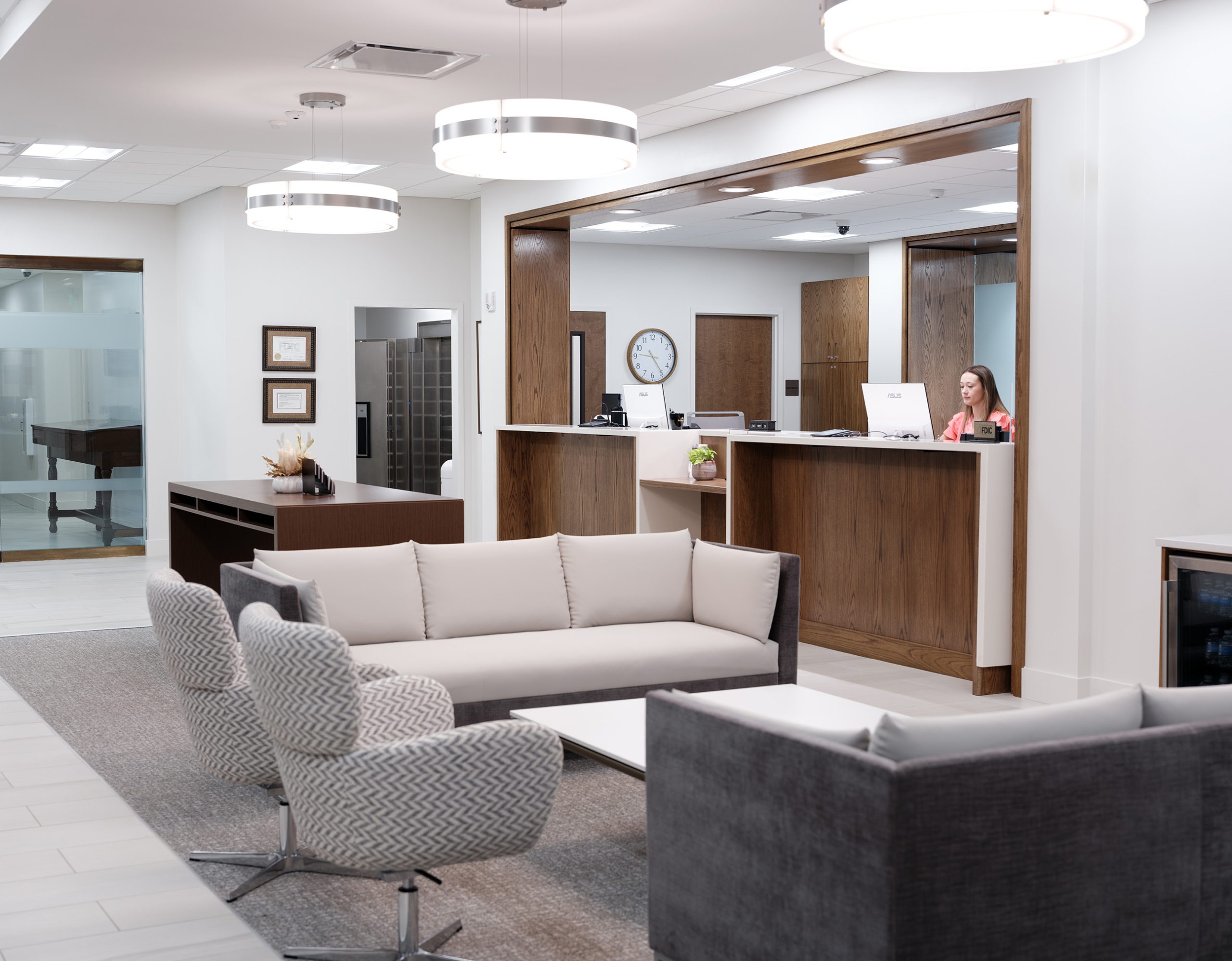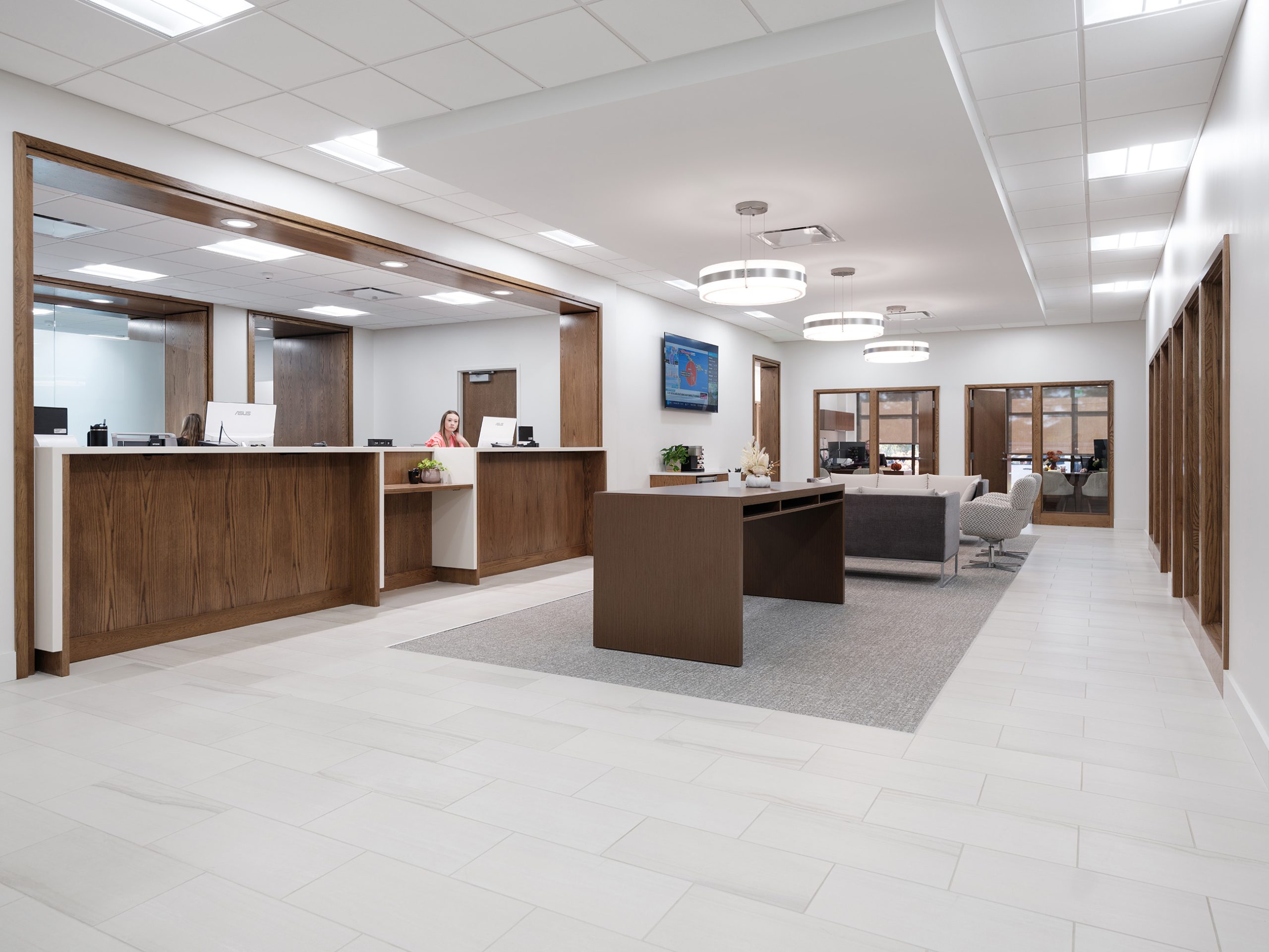 The centerpiece of the project is the redesigned branch lobby that functions like a modern bank: approachable teller stations, comfortable seating areas, and refined branch offices. Another highlight is the large break and gathering spaces on the second floor that comfortably serve the bank staff but can easily pivot into a setting for entertaining customers and hosting board meetings.  The renovation was constructed through three phases that allowed the bank to operate normally throughout construction.