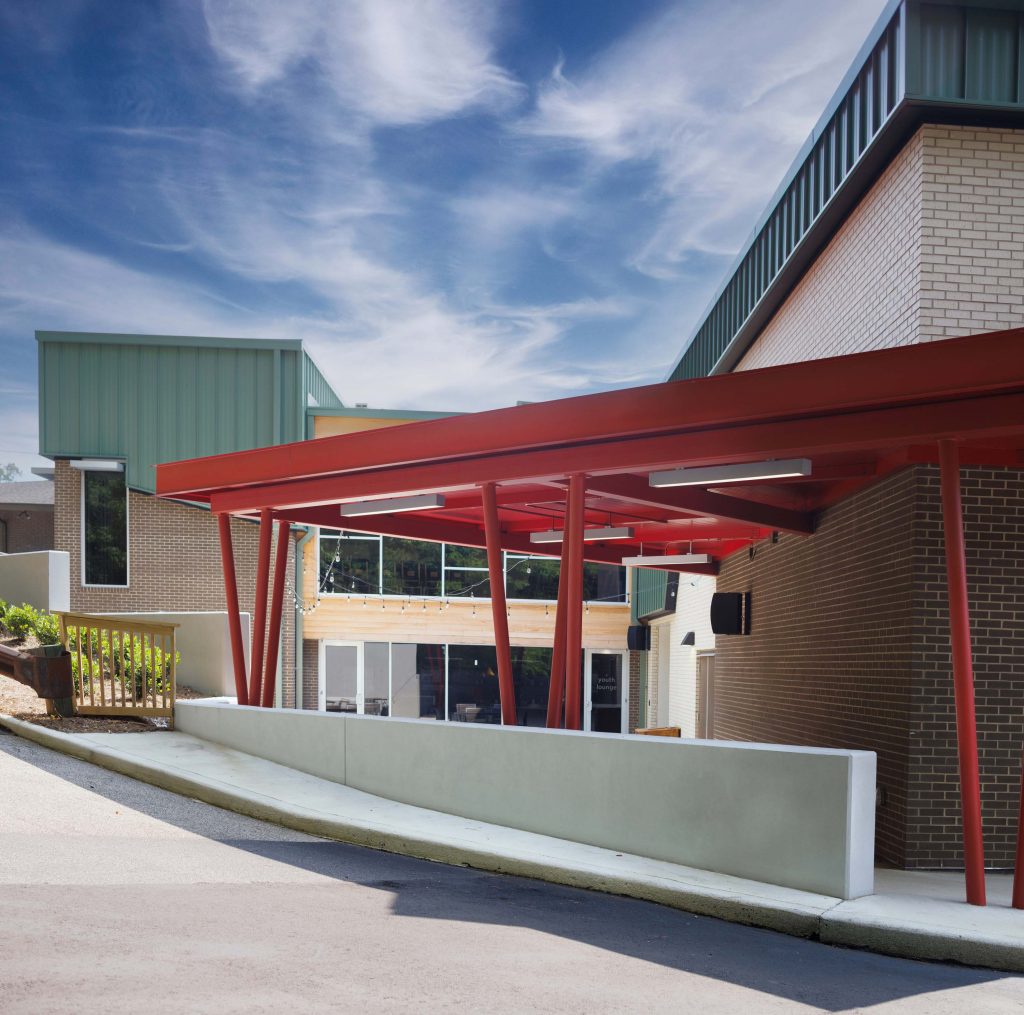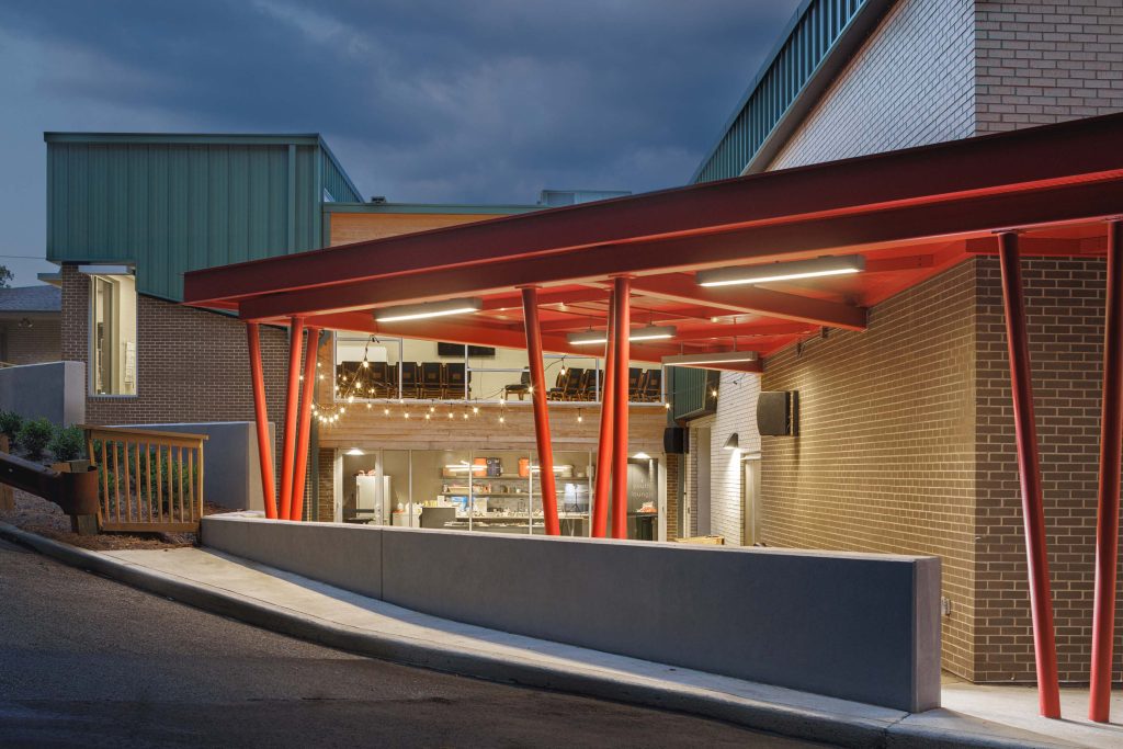 The overall campus design aimed to establish a sense of arrival at both the gymnasium and the youth space. From early concept drawing, the use of red to contrast the campus’s neutral tones allowed for the unique canopies to stand out and establish a sense of arrival.
