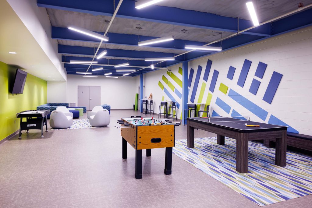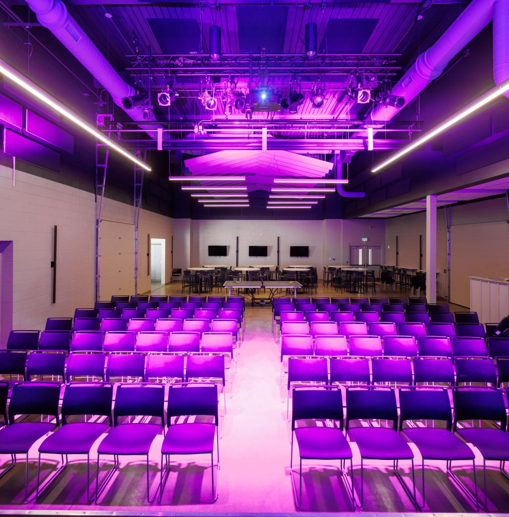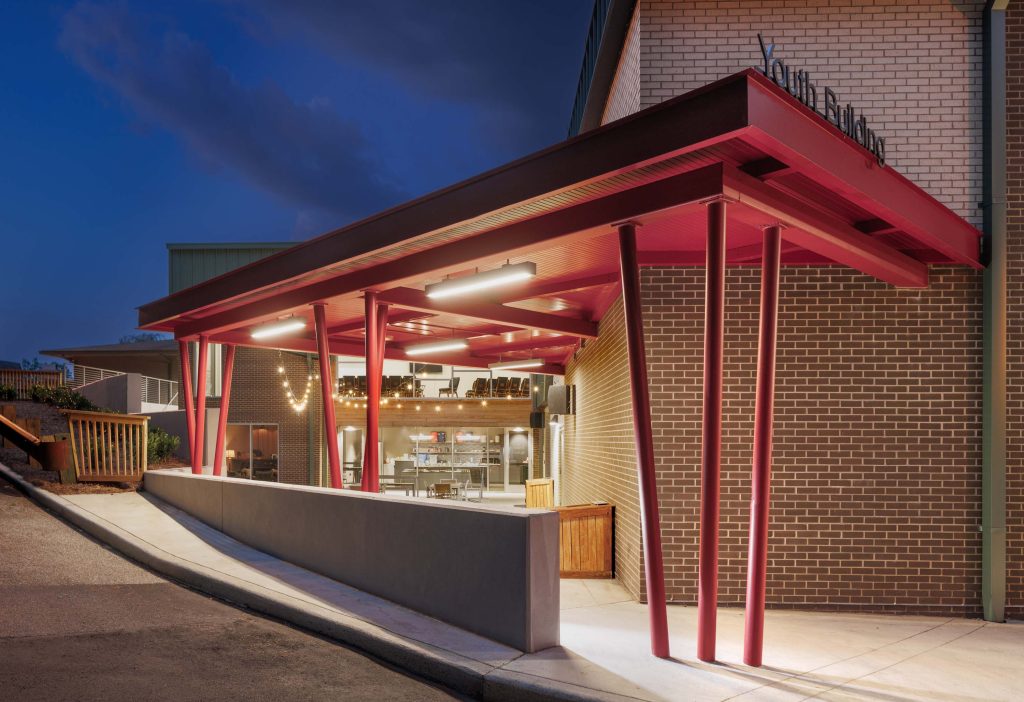 The Youth director’s vision was to create a destination space that focused on worship while providing a place for youth to be themselves. We designed a dual-purpose worship room nestled between the existing gymnasium and a new outdoor courtyard cut into the hillside. These spaces were connected with large overhead garage doors to create a natural flow. The worship space was equipped as a fully functional theatrical “black box” with professional sound and lighting designed by ESB. The 3,500 square-foot Youth space is complete with a lounge area, stage, youth offices, and media area.