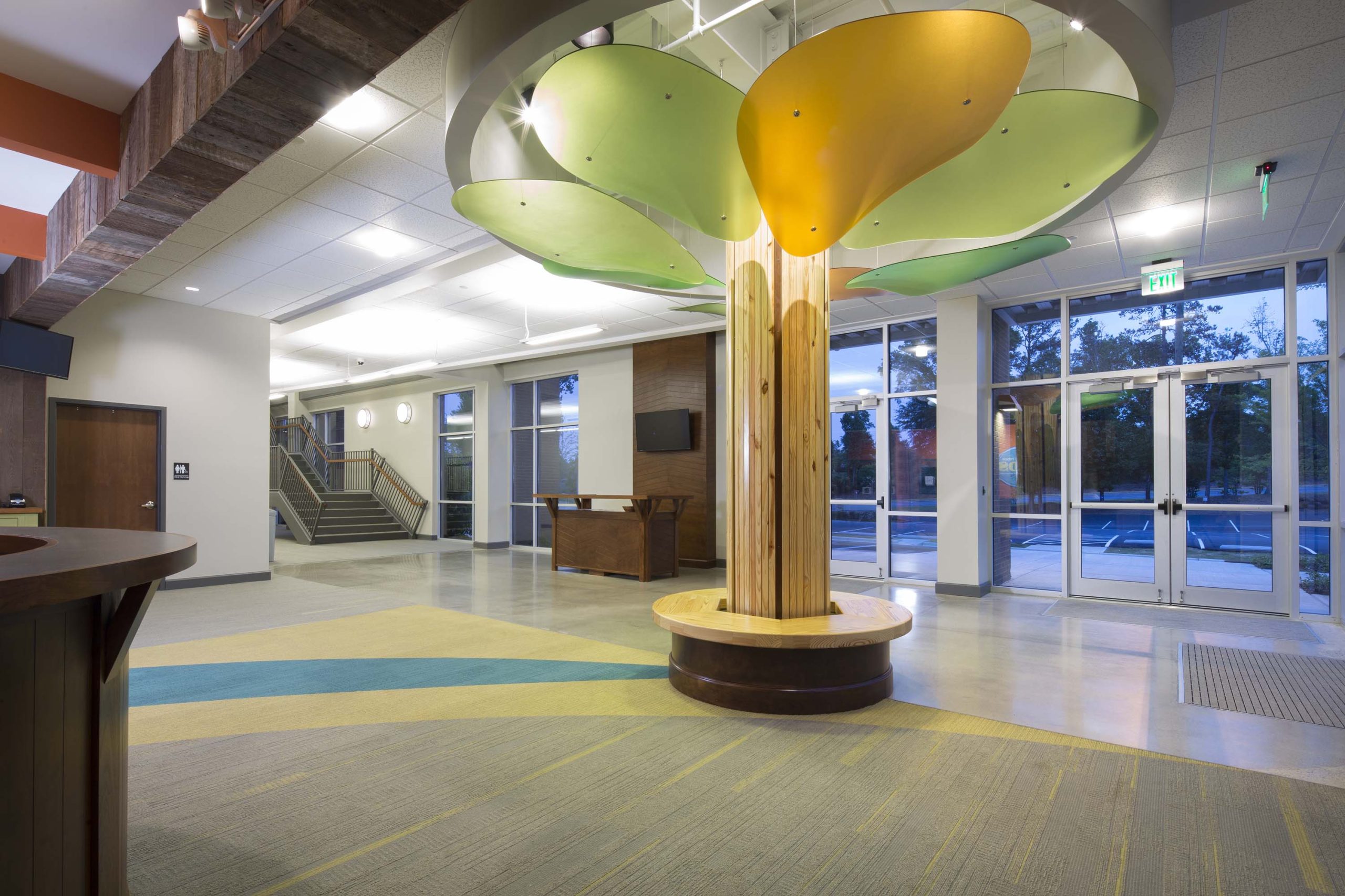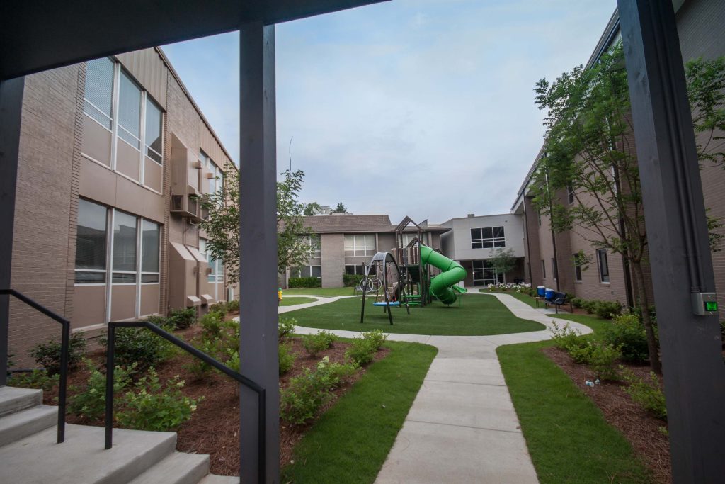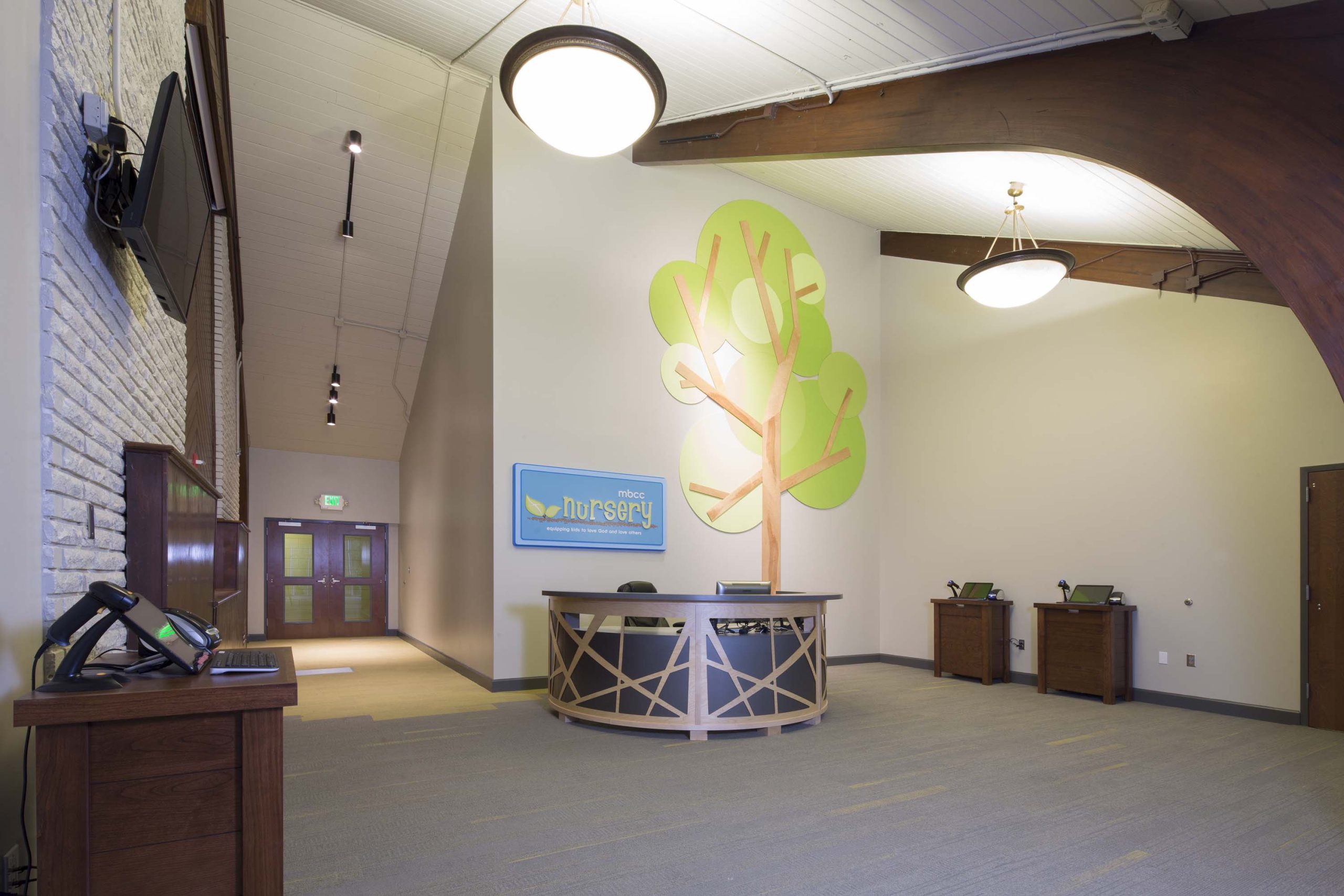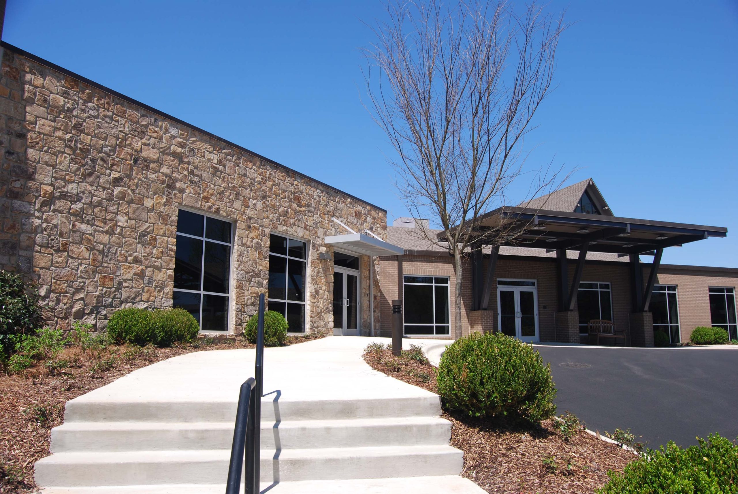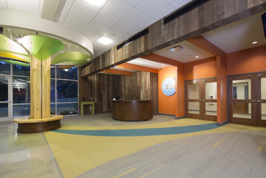 The facilities for Mountain Brook Community Church were constructed in several phases beginning in the mid-1960’s. The church was lacking in a number of components more typical in modern church facilities such as flexibility of spaces and programmed spaces for informal interaction. The construction of new classroom spaces provided the opportunity for both of these. The new facility simplifies the use of the church’s campus; children have classroom and activity spaces on the ground floor, and adults have classrooms on the second floor, with ample informal gathering spaces. A new circulation spine connects all major components of the campus with wide, light-filled spaces. Each area in the building can be accessed directly without have to pass through other program spaces. This circulation area also provides main entrances to the facility, and driveways have been reworked to remove accessibility barriers by moving parking closer to the entrances thus increasing safety for pedestrians. The success of the design is grounded in the arrangement of new program spaces that function well while still having interior and exterior spaces for informal gathering. In the new facility, there is now room for members and visitors to talk naturally generating the development of community to develop in ways that it could not in the former cramped passageways and narrow sidewalks.