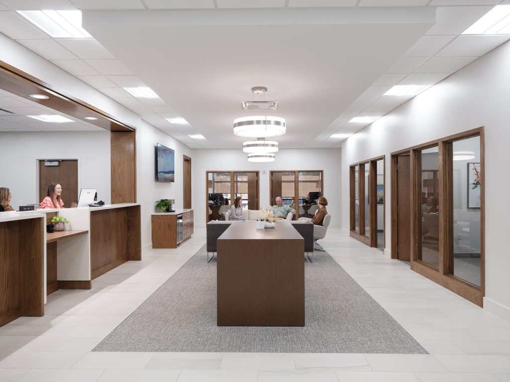 The exterior is composed to blend with the surrounding residential neighborhood, using materials and forms common to local homes. The building’s massing and landscaping minimize its visual impact and maintain neighborhood character, while practical considerations-such as concealing rooftop equipment-are integrated into the design.