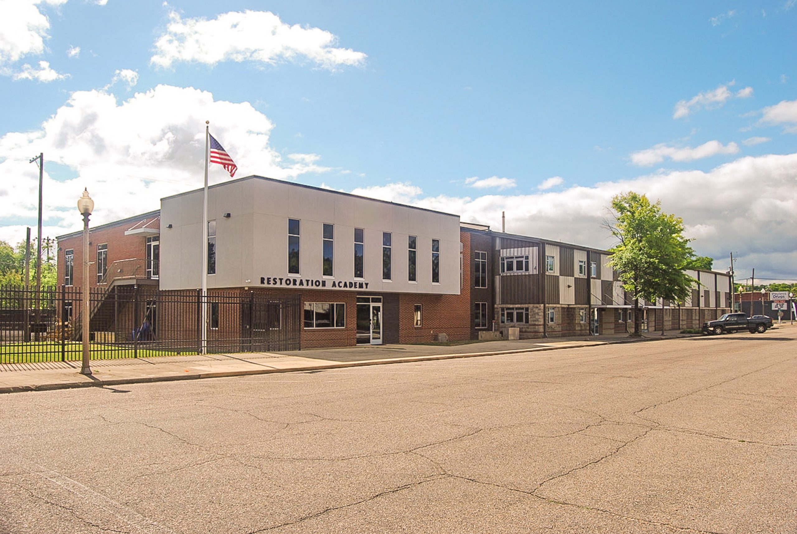 Restoration Academy needed a design that served the full purpose of the institution. The addition provides a community-focused face to the school. As part of the concept for the addition, the design focused on bringing the exterior of the existing metal building into conversation with the new building along main street. The school’s main office is now located at the center of the building, fronting on Gary Avenue. This new arrangement gives the school a stronger presence from the sidewalk.