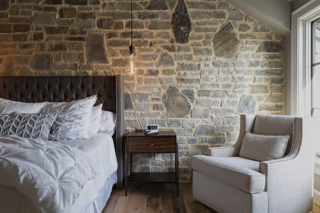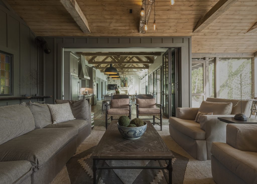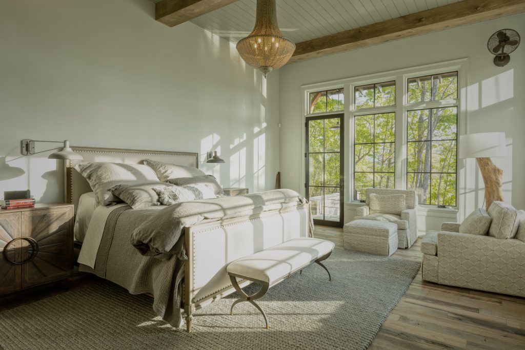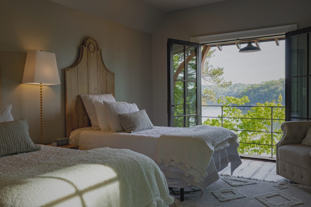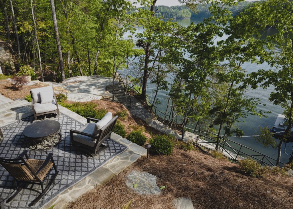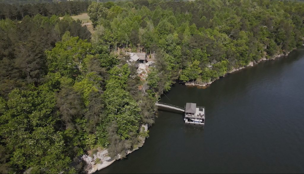 Taking advantage of relaxed lake living, three bedrooms are accessed on the other side of the screened porch from the main house. The master suite is located on the far side of the bridge, with a private outdoor terrace located above the waterfall. At one end of the living space, a partially concealed staircase rises behind the massive fireplace and leads to an office located above the master bath.