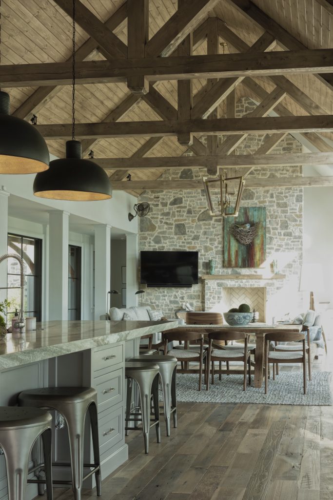 Because of the rugged, steeply sloping terrain, every space in the house has a unique view of the lake and to the land around the house. The very linear nature of the house is strategic in several ways: it takes advantage of the 1,200 feet of waterfront and encourages movement into the property to either side for future opportunities (camp sites, overlooks, trails); it allows every living space to see the lake front and center; and it minimizes the required excavation for a home of this size where 80% of the living space are on the main level.