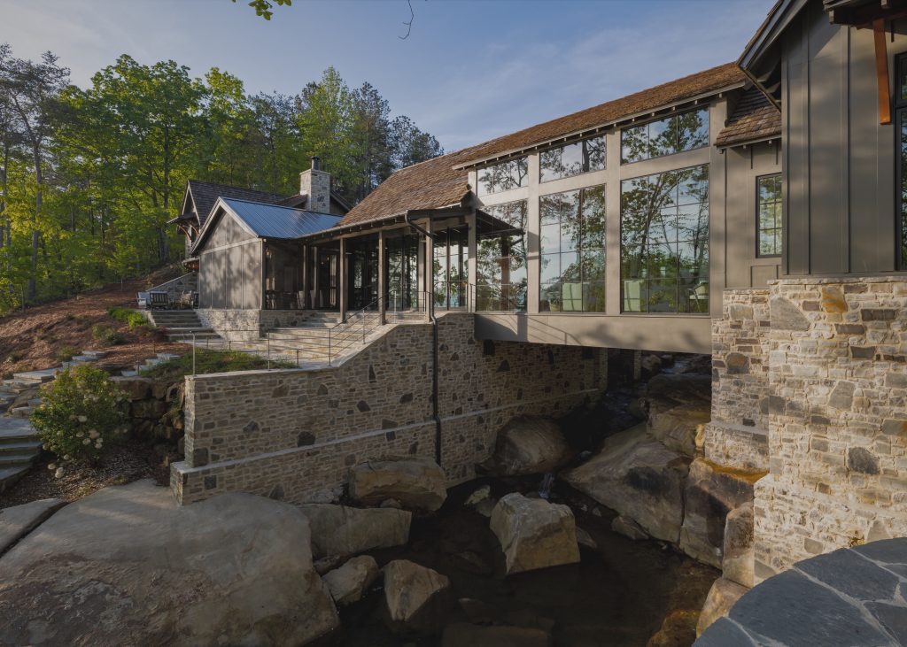 When we began studying options for designing a new lake home for a family of eight, we found our selves being drawn closer and closer to the best part of their large waterfront lot: a wet-season stream that falls across the property before plummeting 40 feet into Smith Lake.