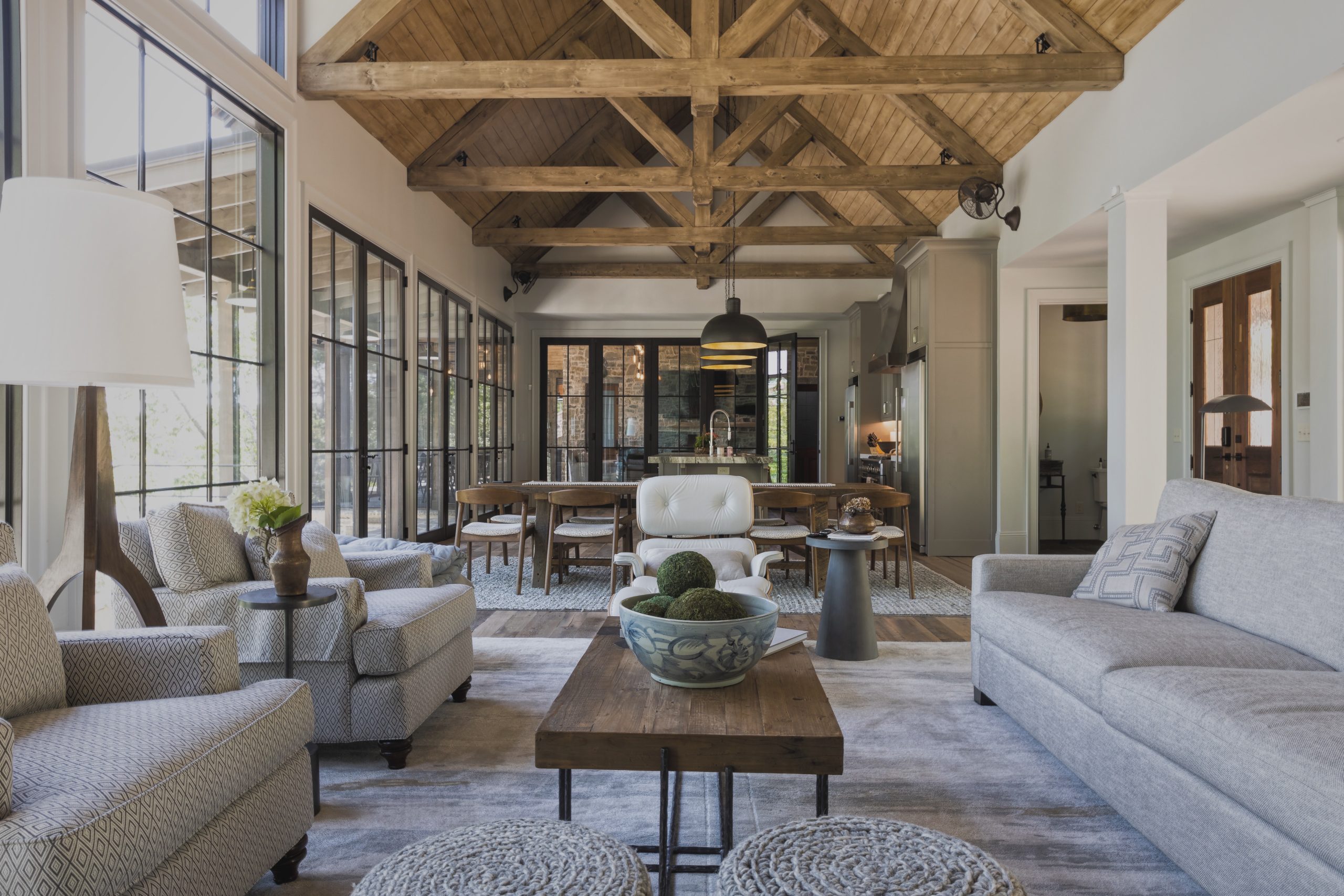 Taking advantage of relaxed lake living, three bedrooms are accessed on the other side of the screened porch from the main house. The master suite is located on the far side of the bridge, with a private outdoor terrace located above the waterfall. At one end of the living space, a partially concealed staircase rises behind the massive fireplace and leads to an office located above the master bath.